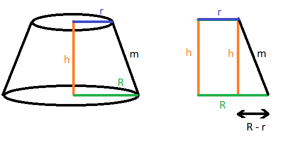 Benötigt wird h, r (Radius Deckfläche) und R (Radius Grundfläche):