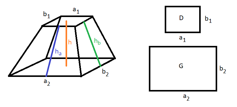 Formeln: (sqrt = Quadratwurzel) D = a1*b1 G = a2*b2 V = 1/3*h*(G + sqrt(G*D) + D) ha= sqrt(h2 + (b2 - b1)2/4) hb= sqrt(h2 + (a2 - a1)2/4) M=(b1 + b2)*hb + (a1 + a2)*ha O = M + G + D